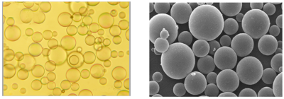 图1 空心玻璃微珠(左图显微镜观察、右图为扫描电镜观察)